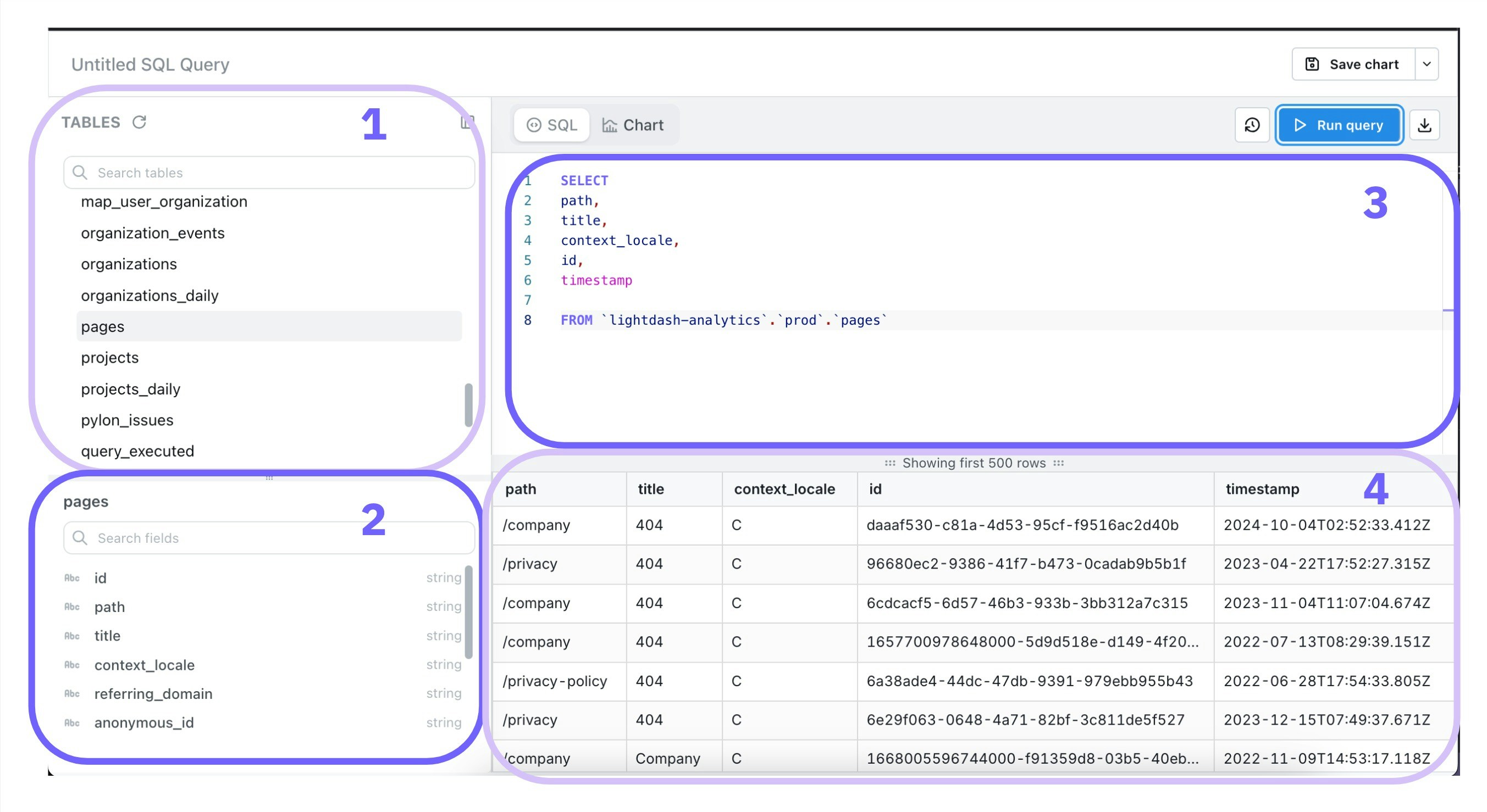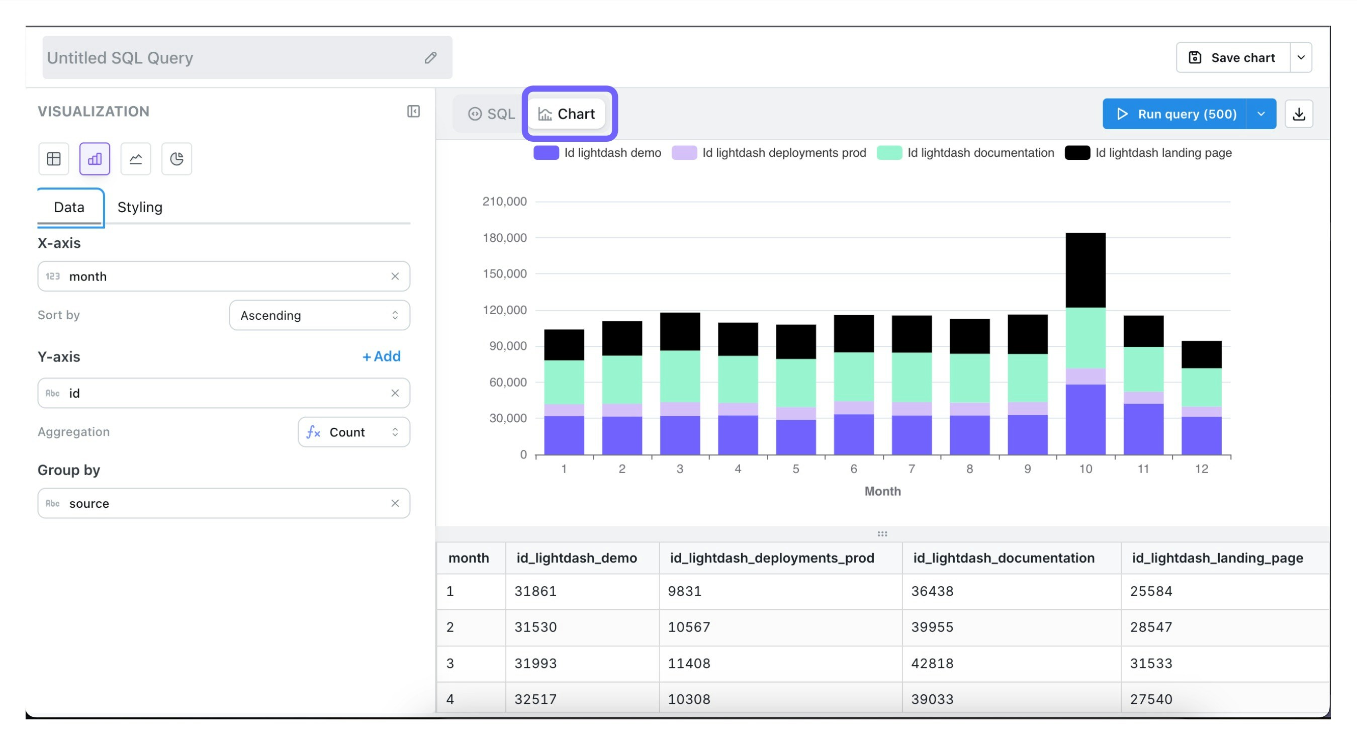 Once you’ve run your query, you can build a chart by clicking on thechart tab in the SQL Runner.
